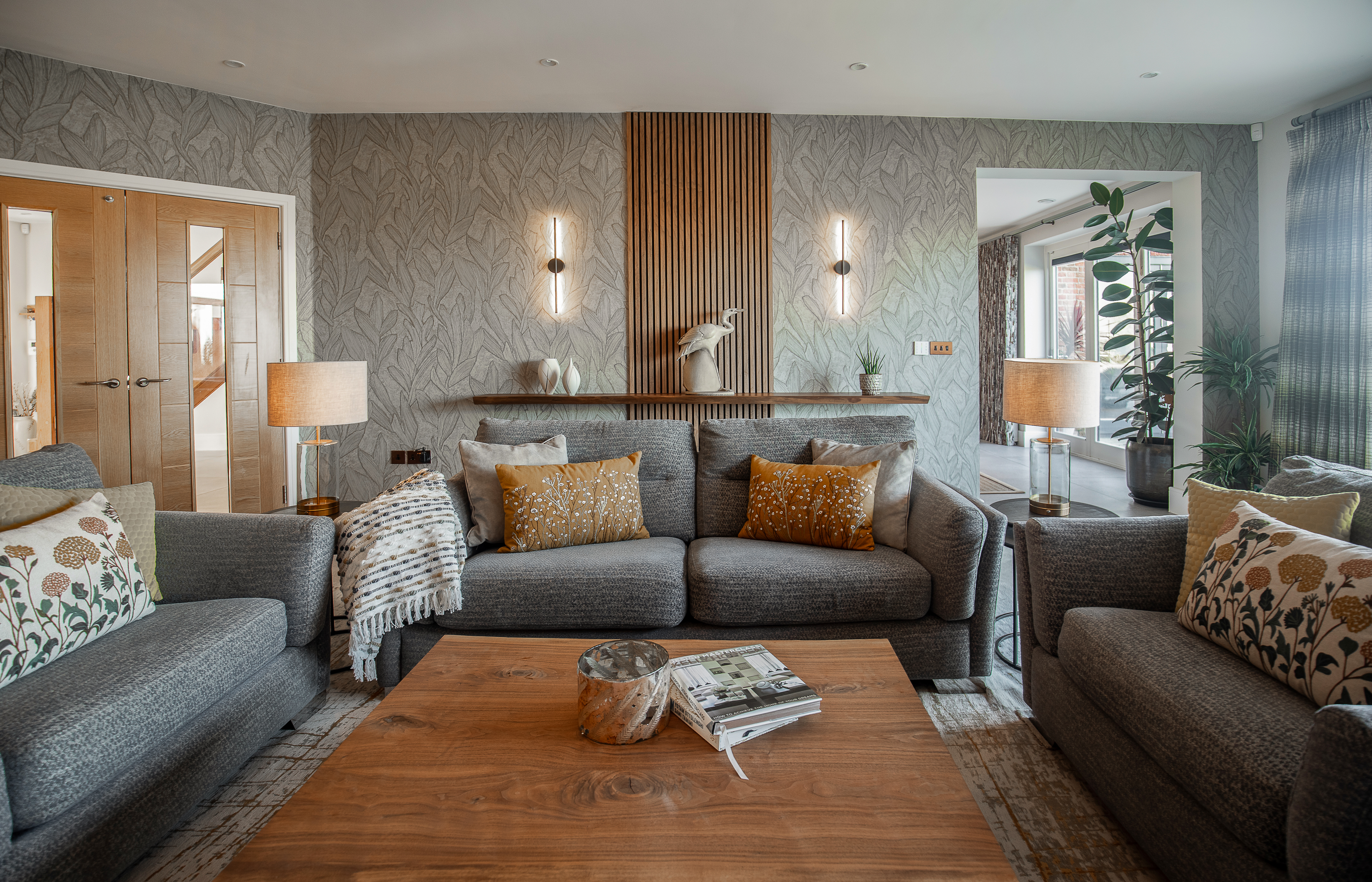 The main wall had no features which meant that the temptation was to push the sofa back against the wall. This wasn't very cosy, so we selected a large single length of solid walnut and created a living edge floating console style table set within a section of acoustic panelling to add texture and height to the room. We added a textured feature wallpaper to two walls and added wall lights in either side of the fire and above the walnut console table creating a vignette and focal point. Adding a feature to the corner again added texture and height and balanced the fireplace wall as this was asymmetric.